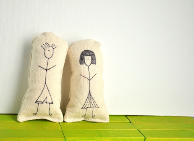 So here’s the story. My two-year-old has started pretending, hardcore. She found a bucket full of figurines at grandma’s house the other day and had them act out these elaborate scenes (greetings, drama, Winnie the Pooh falling off a table!), which is great…who doesn’t love to see a wee imagination at work? But. It seemed too bad that this was all happening with plastic Disney princesses, so I decided to make her some little tiny stuffed characters of my own. We have my drawing “skills” to thank for their stick-figure-ness.