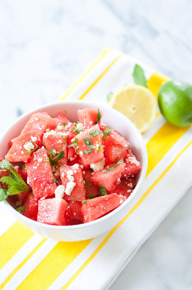 Add a few drizzles of olive oil to barely coat the watermelon. Add the juice of one lemon and lime. And, some of the zest. Wash and chop some mint and sprinkle onto the watermelon. Sprinkle on the desired amount of feta cheese and mix. Add a teeny sprinkle of salt and pepper if desired.